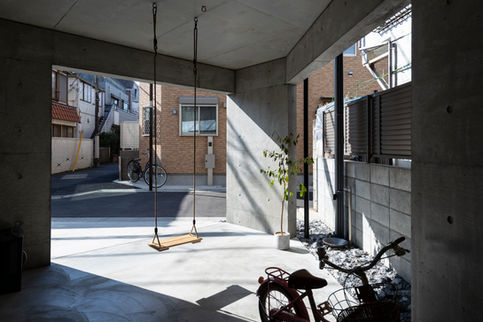 In the back of a winding alley in Sendagi, a vacant lot was created by the demolition of an apartment building. Due to the four-way subdivision of the property, the northern end became an irregularly shaped plot. A couple chose this northernmost end to build a new home for their family of four. To the north of the site are traditional two-story wooden houses, while to the south, a new three-story, regularly-shaped house has begun to be built. Due to the narrow road and difficult access for material delivery, the structure was limited to wood. The client, who enjoys mountain climbing and camping, wanted a simple house that could accommodate hanging items like hammocks and swings. It felt unnatural to simply cover such a house with uniform fireproof materials, just because it's in the city.Therefore, we used continuous pillars of a length that could just barely be brought in, and made the exterior walls a fire-resistant structure, which allowed us to expose the wooden framework of the ceiling. On the first floor, we created an earth-floored space (doma) and a porch to store and maintain outdoor gear. We created a void to allow morning light to reach the wet areas in the back. In the afternoon, light reflects off the mirrored sliding doors, filling the space with a soft brightness. On the second and third floors, sunlight entering the upper part of the building is diffused throughout the entire house via a top light and a glass floor. The glass is precisely fixed with rubber without sealant, so the client can easily replace the material. When the top light is opened, a breeze flows through the stairs.Although the staircase is at the center of the house, it follows the wall due to the plot's unique irregularity, allowing light and wind to pass through while providing flexibility for daily life. Here, the building is not parallel to the boundary of the front road. Since the plot extends diagonally inward, we incorporated this diagonal axis into the architecture, offsetting it from the road's axis. We hoped that this would create a new relationship between the house and the town. The design allows the connection to the ground to gradually fade as one moves upward, and the misalignment with the town's orientation to be perceived as a subtle sensory shift. On the first floor, the road, the ground, and one's body are continuous, facing the diagonal wall. As you ascend to the second floor, your body acclimates to the diagonal due to the effects of the beams and floor, and you can dynamically experience the shift from the town through the north and south windows. On the third floor, most elements of the building are diagonal, making the diagonal seem straight and calming. From there, when you look out the window, the town appears to have a diagonal face, leaping into view. We have carefully woven this fluctuation (back and forth) of sensation into the daily enjoyment of the house.